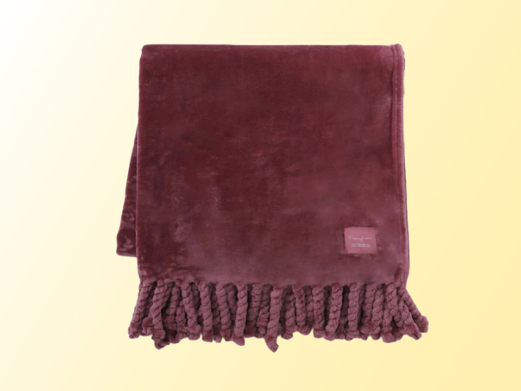 触り心地なめらかなスロー(ひざ掛け)です。シーンを選ばず使えるカラーで、両端の大きなフリンジがアクセントです。