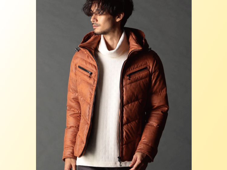 ウエストシェイプが綺麗なシャープシルエットのライダースダウンブルゾン。同系色のムラプリントで奥行きのある見え方に。マイクロスウェードの滑らかなタッチ感と上品な光沢が◎。